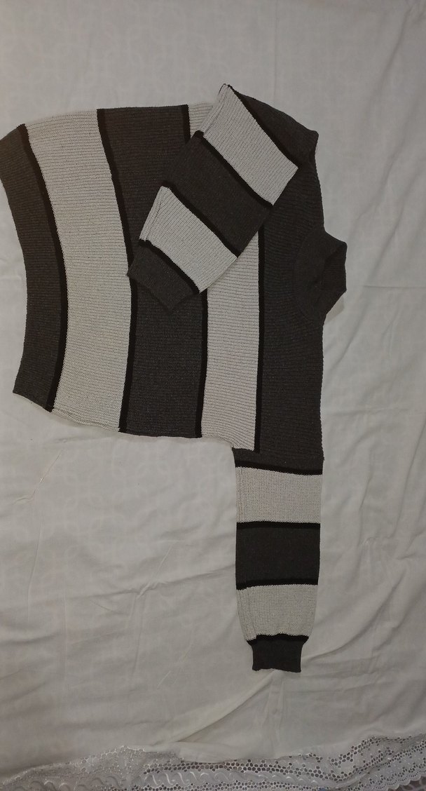 Gri çizgili, uzun kollu, salaş kesim kadın kazak. Örgü kumaştan yapılmış, midi boyda, rahat sokak stili için uygun.