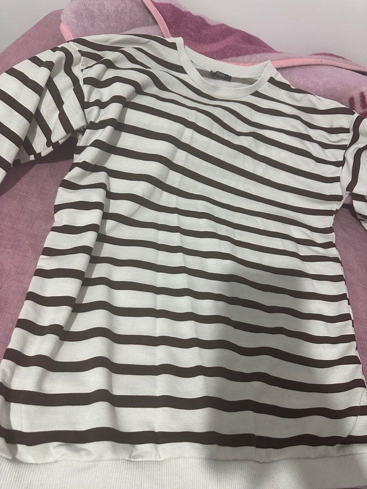Gri çizgili beyaz, uzun kollu, salaş kesim kadın tişörtü. Yuvarlak yaka ve pileli detaylara sahip, midi boyda, yumuşak sentetik kumaştan üretilmiştir.