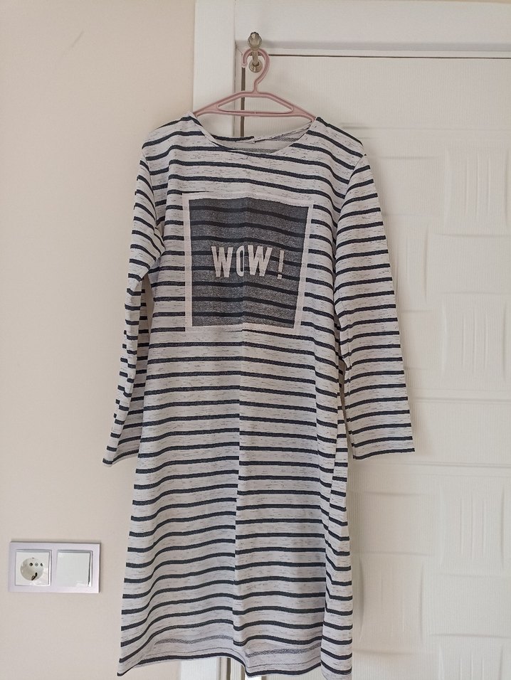 Gri renkli, uzun kollu ve tekne yaka triko elbise, bol kesim ve çizgili desene sahip. Önünde dikkat çeken "WOW!" baskısı bulunur. arka kısmında minik bir delik var sadece 40-42 beden