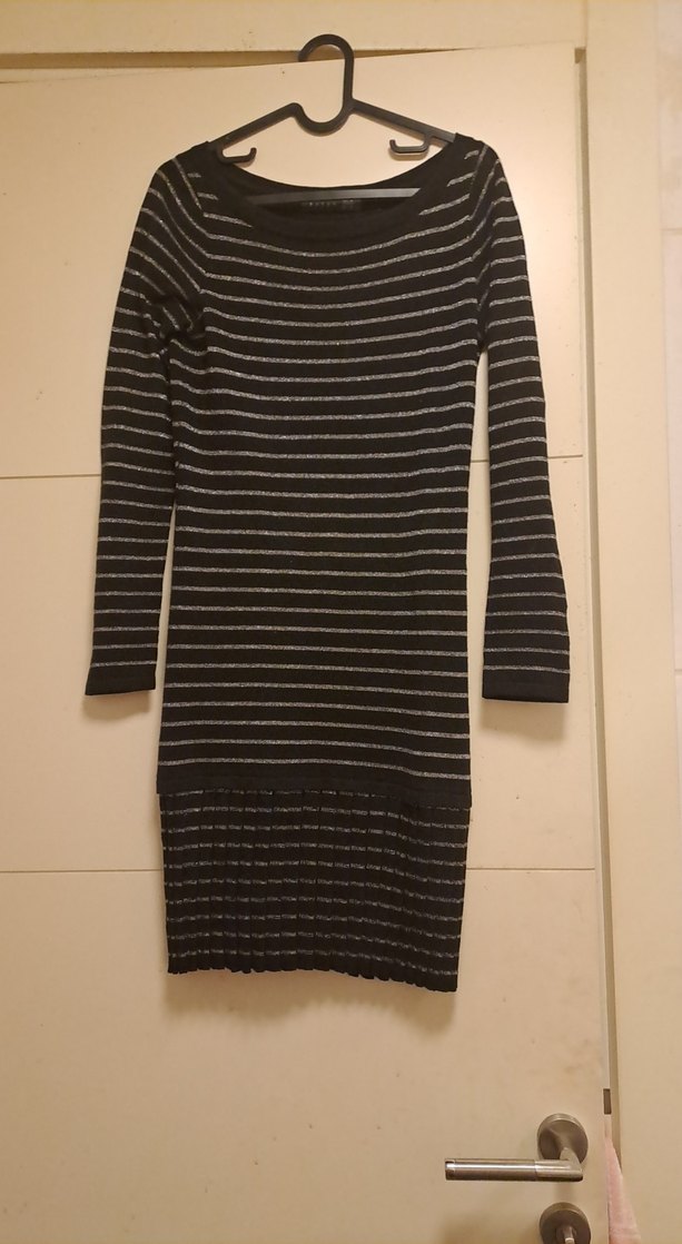 Gri renkli, çizgili ve pilili detaylara sahip, uzun kollu triko elbise. Vücuda oturan kesimi ve tekne yaka tasarımıyla midi boyda.