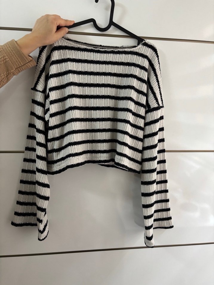 Uzun kollu, salaş kesim kadın kazak, triko dokuma ve gri çizgili desene sahip. Normal midi boyda, günlük sokak stili için uygundur.