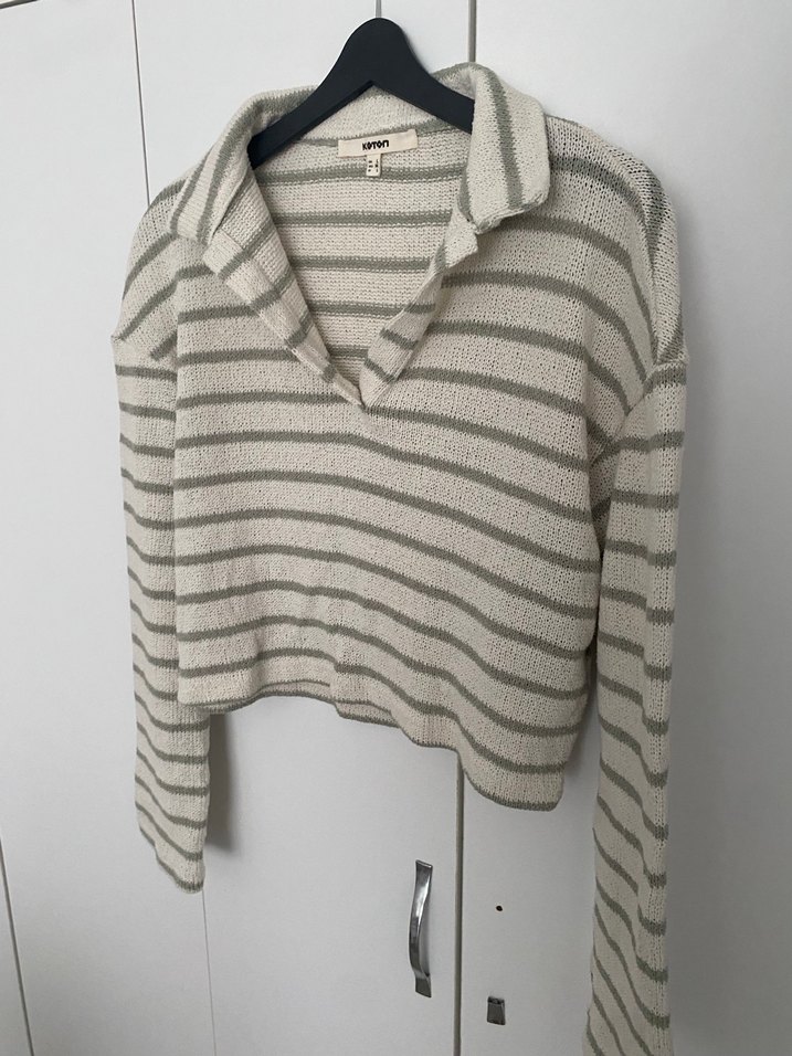Gri çizgili, uzun kollu, yakalı ve bol kesim triko kazak, günlük rahat kullanım için uygundur. Sayılı giydimtemizdir