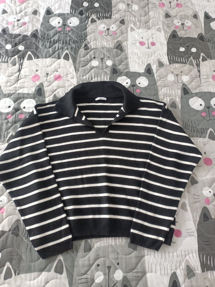 Gri ve beyaz çizgili, yakalı ve uzun kollu, bol kesim, normal boyda triko kazak. Rahat sokak stiline uygun.