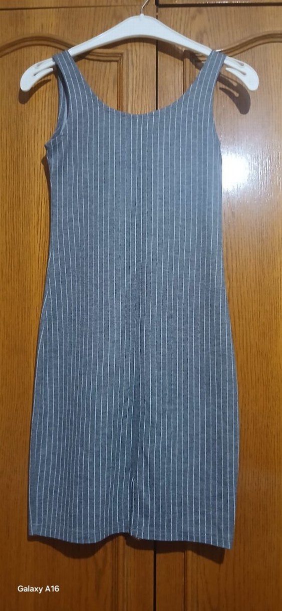 Kolsuz, uzun kesim ve regular fit gri çizgili kumaş elbise. kesik yaka detayıyla günlük kullanıma uygundur.