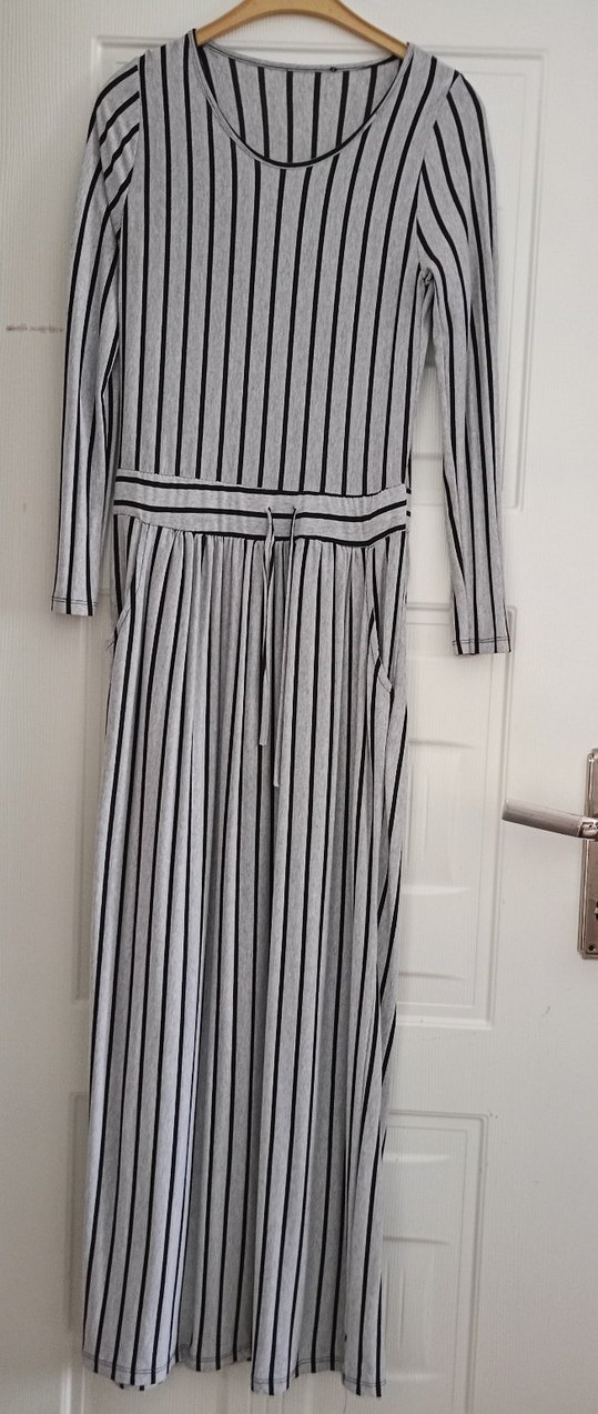 Gri renkli, çizgili ve pilili uzun elbise. Salaş kesim, kayık yaka ve ince askılı kollara sahip, yumuşak sentetik kumaştan üretilmiştir. Günlük sokak tarzı için uygundur.