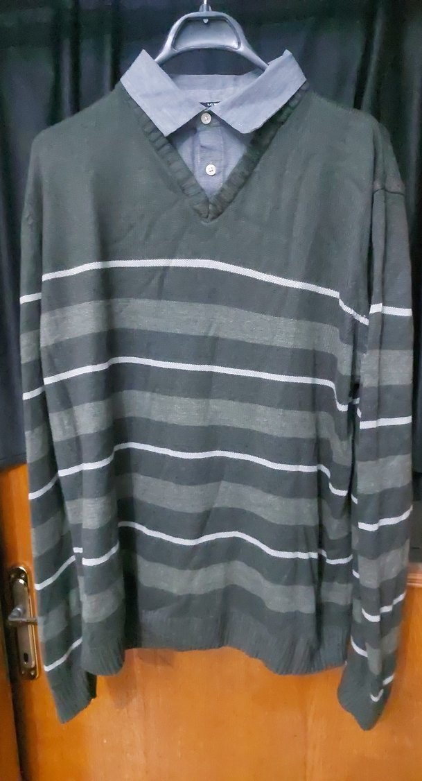 Gri renkli, yakalı ve uzun kollu erkek kazak. Bol kesim, yatay çizgili ve örme dokulu, günlük rahat stil için uygun.