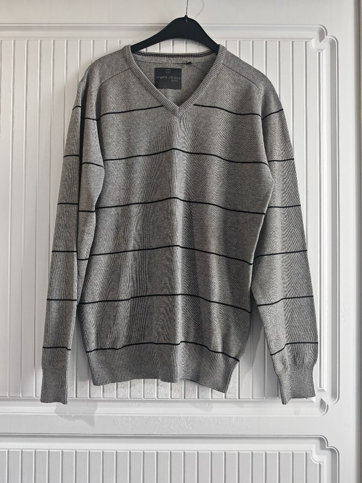 Gri renkli, çizgili desenli, yün örme kumaştan yapılmış V yaka ve uzun kollu erkek kazak. Rahat kesimli ve normal boyda, günlük sokak tarzına uygun.