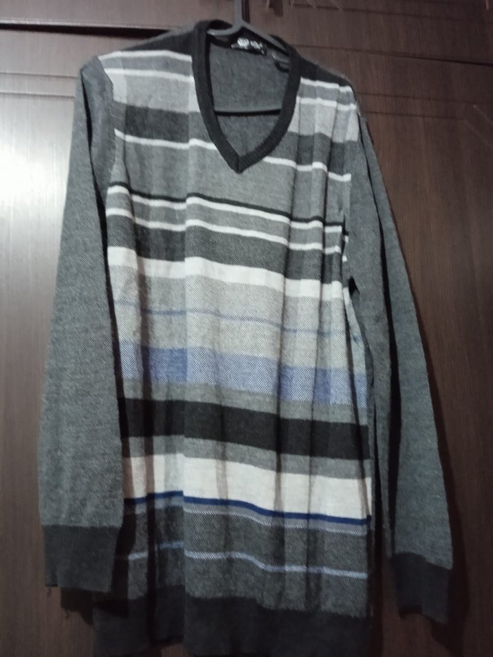 Bu erkek trikosu, bol kesim, uzun kollu ve V yaka olarak tasarlanmıştır. Sentetik kumaştan örülmüş olup gri tonlarında çizgili desene sahiptir, günlük sokak stili için uygundur.