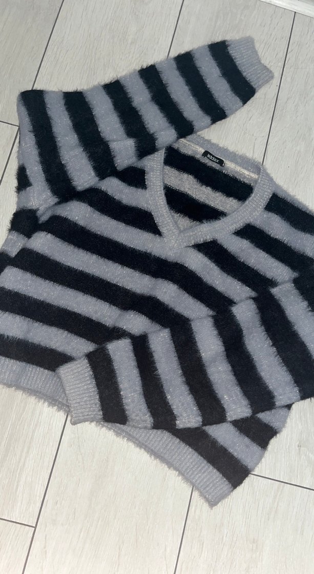 Gri ve siyah çizgili, V yaka ve uzun kollu kadın triko kazak. Rahat kesimiyle günlük sokak modasına uygun, yumuşak dokulu örme kumaştan üretilmiştir.