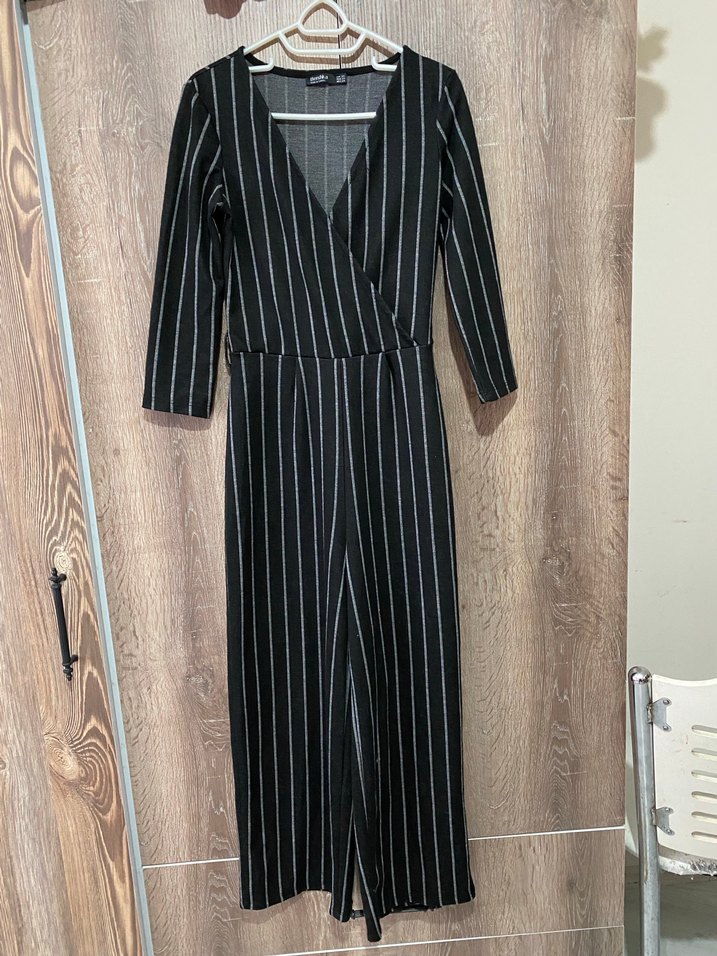 Gri Çizgili V Yaka Kadın Tulum