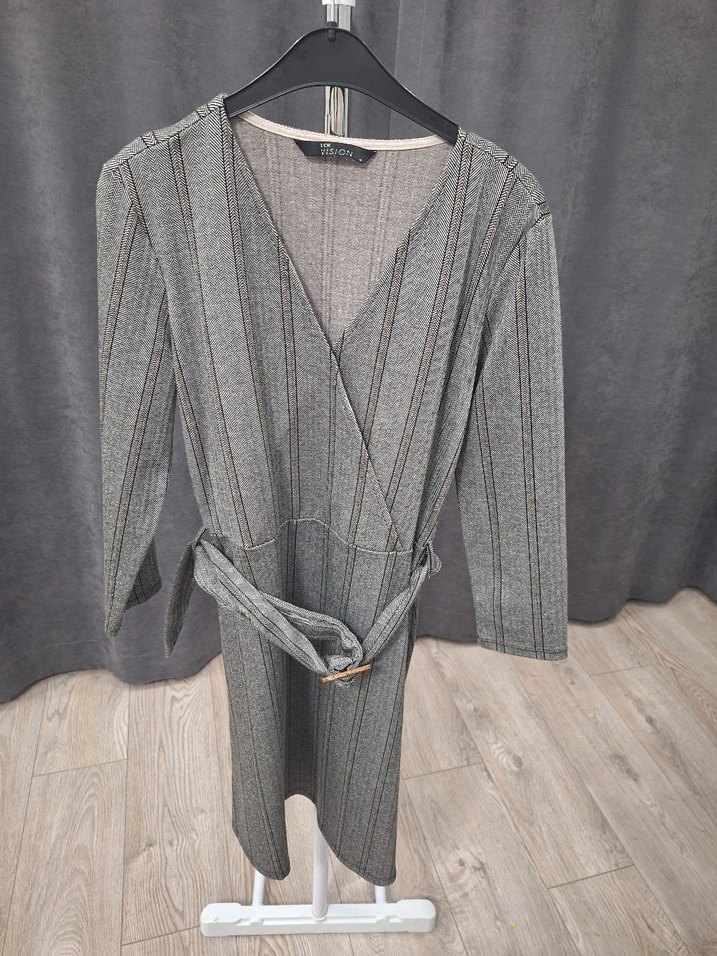 Gri çizgili mini elbise, V yaka, uzun kollu ve kemerli. Rahat kesimi ve sokak stiline uygun tasarımıyla günlük kullanım için uygundur.