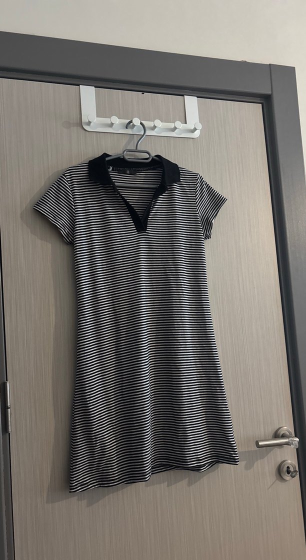 Gri çizgili midi elbise, kısa kollu ve V yakalıdır. Fitted kesim ve pliseli detaylara sahiptir, yumuşak sentetik kumaştan üretilmiştir, günlük sokak stili için uygundur.