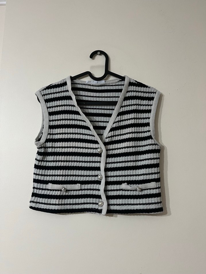 Gri Çizgili V Yaka Kısa Örgü Kadın Yelek