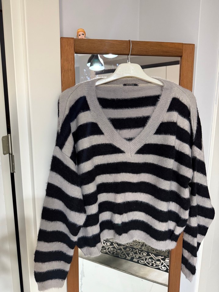 Gri ve siyah çizgili, V yaka, uzun kollu, bol kesim triko kazak. Sakallı kumaş