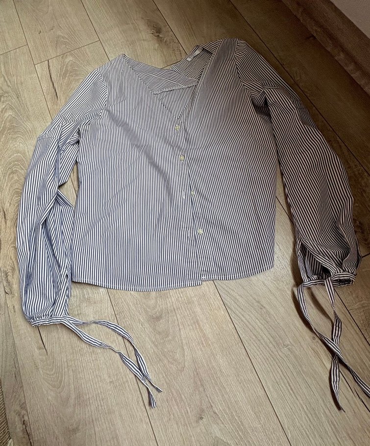 Pamuk kumaştan, uzun kollu, düğmeli ve V yakalı gri çizgili kadın gömleği. Salaş kesimi ve bağcıklarıyla rahat bir tarz sunar.