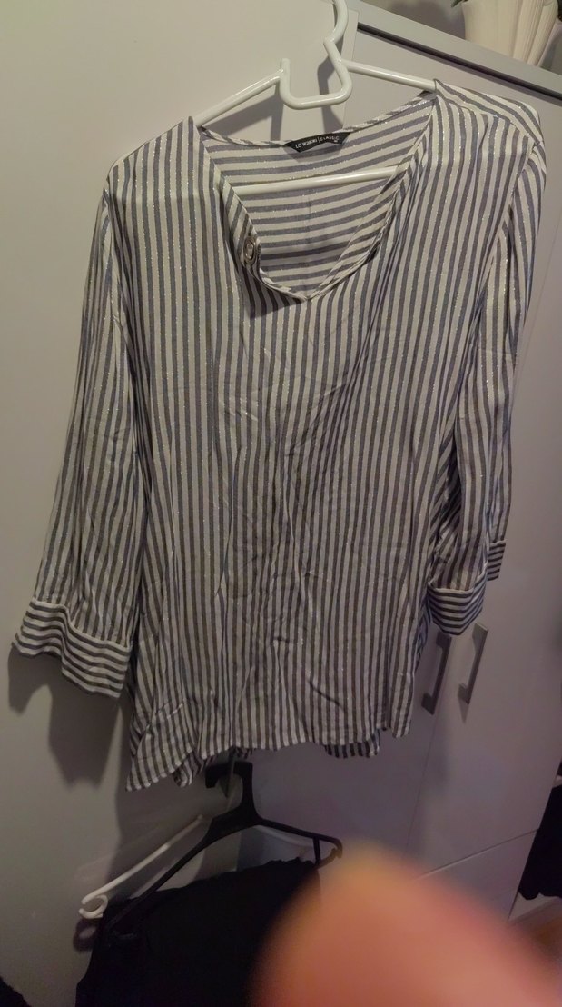 Gri keten kumaştan, uzun kollu, V yakalı ve düğmeli kadın gömleği. Çizgili deseniyle rahat ve günlük sokak stiline uygun.