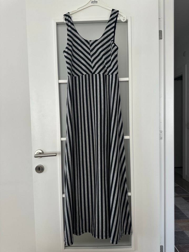 Gri çizgili, V yakalı, kolsuz uzun elbise. Pilili ve düz kesim, sentetik kumaştan, günlük rahat sokak stili için uygundur.