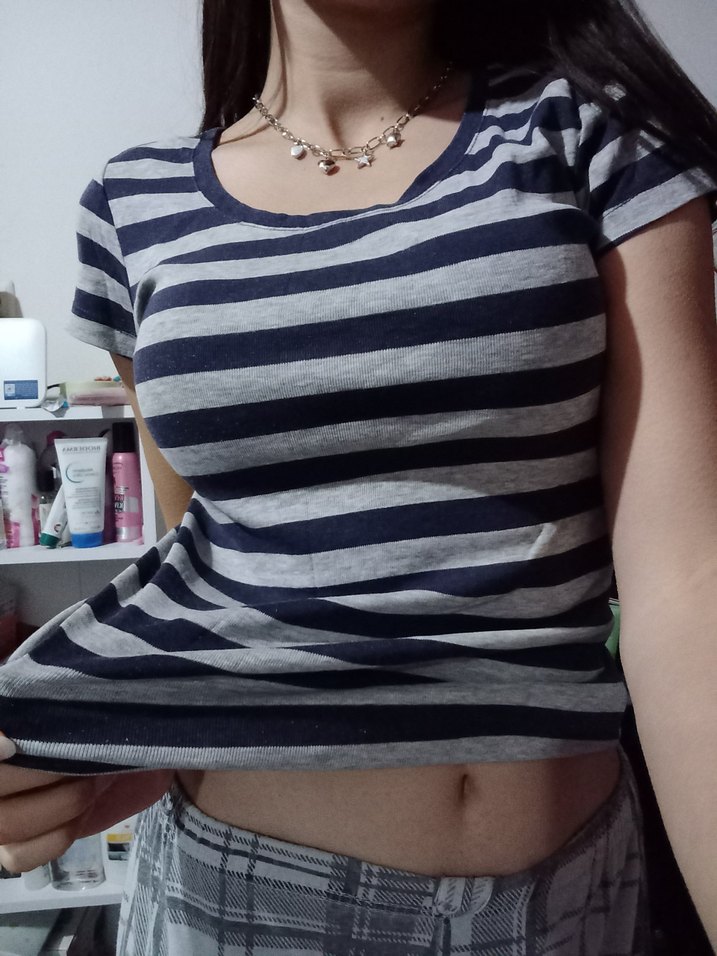 Vücuda oturan, kayık yaka ve kısa kollu tişört. Pamuklu, gri tonlarında çizgili desene sahip, günlük rahat kullanım için uygun.