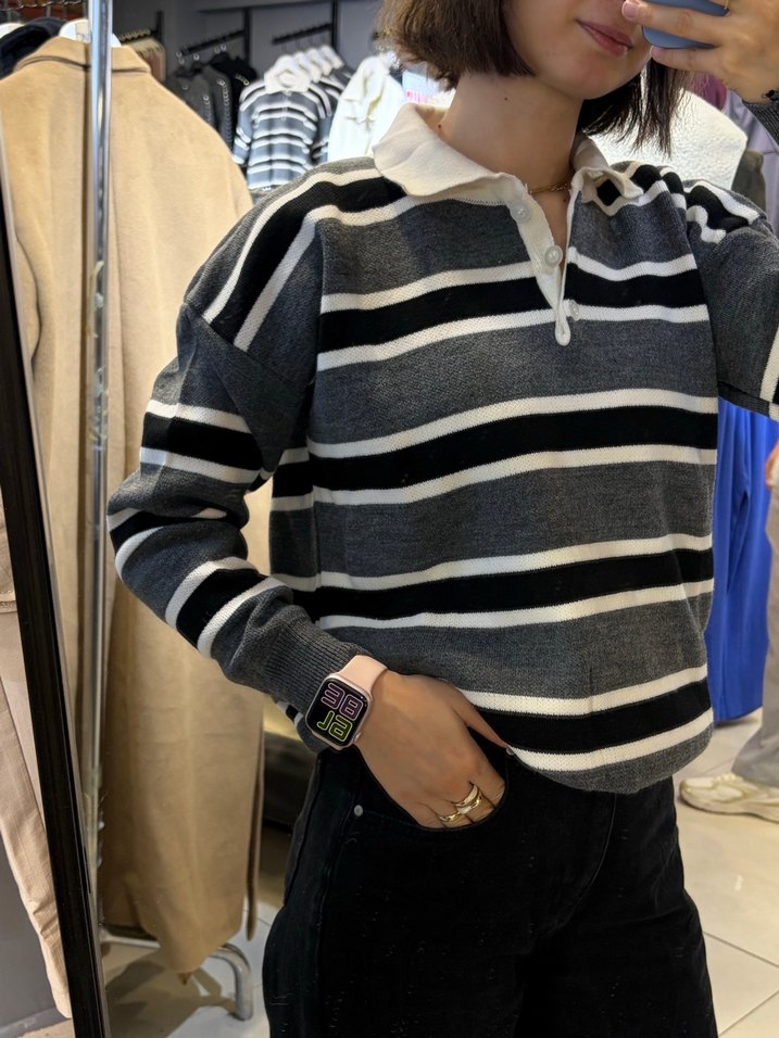 Gri tonlarında çizgili, yakalı, uzun kollu, bol kesim kadın örgü kazak. Günlük kullanıma uygundur.