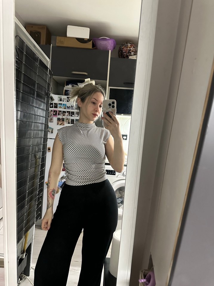 Gri çizgili denim kumaştan, yüksek yakalı ve kolsuz, normal boyda, fitted kesim crop top. Günlük kullanıma uygun, trend ve zahmetsiz şıklık sunar.