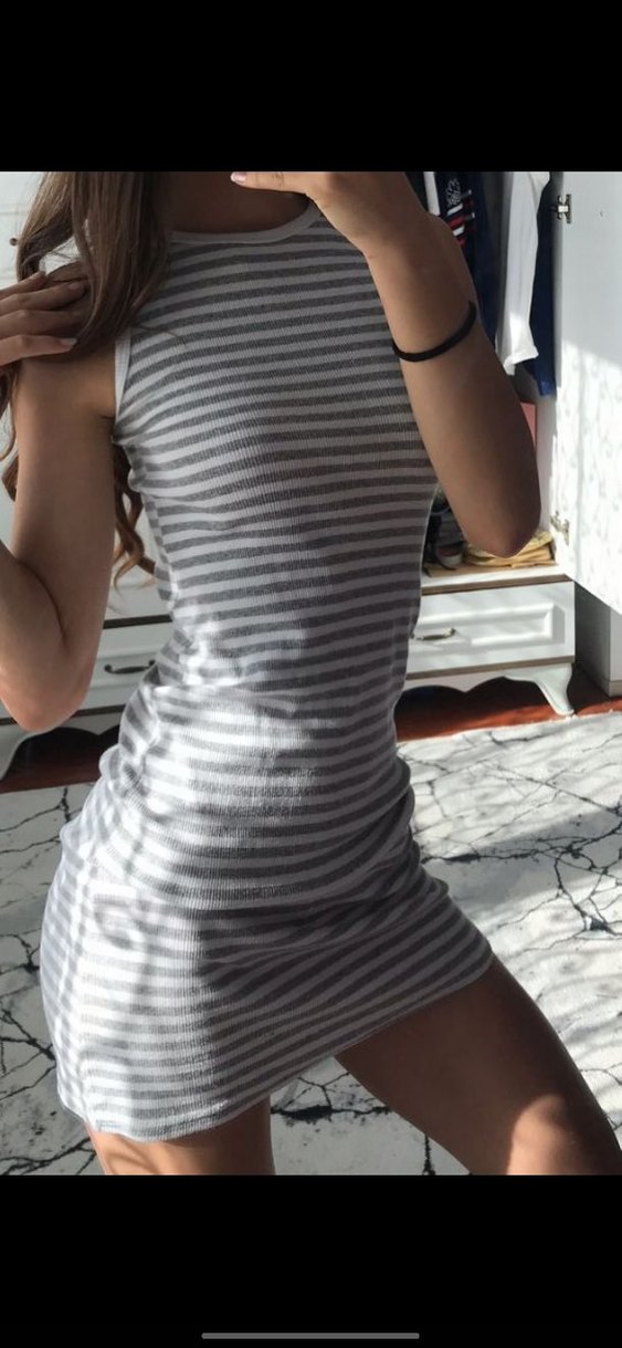 Yüksek yakalı, kolu olmayan, gri çizgili, vücuda oturan midi elbise. Pürüzsüz sentetik kumaştan yapılmış, gündelik sokak stili için zahmetsiz şıklık sunar.
