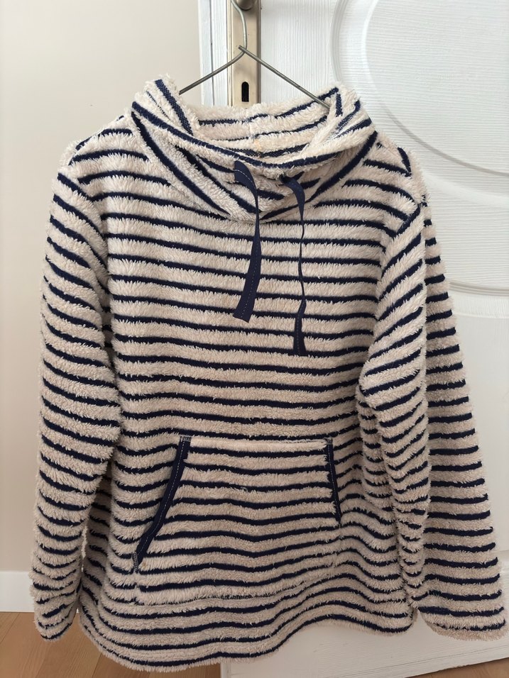 Gri çizgili kadın kazak, yüksek yakalı ve bağcıklı. Uzun kollu, bol kesim ve yumuşak örgü dokulu, rahat ve şık bir günlük kullanım parçası. Önde cep bulunur.