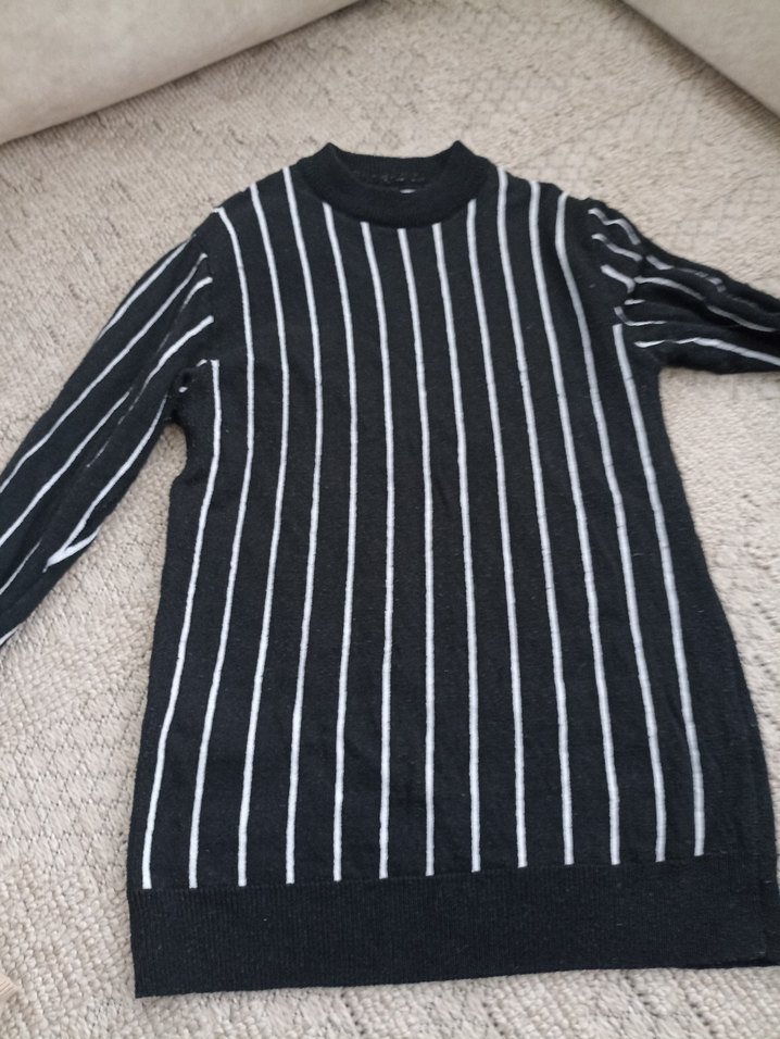 Uzun kollu, boğazlı kadın kazak, yumuşak yün ve çizgili örgüdesi ile rahat bir kesime ve normal midi boyuna sahiptir. Sokak stili için uygundur.