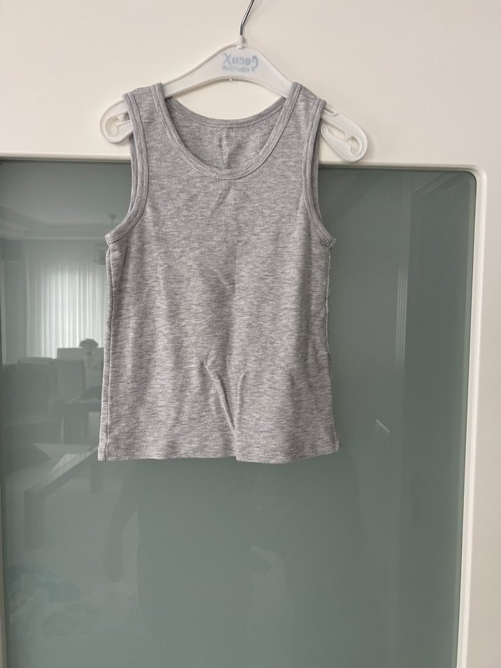 Yumuşak ve rahat kumaştan yapılmış, düz gri renkli çocuk atlet. Katmanlama veya günlük kullanım için uygundur.