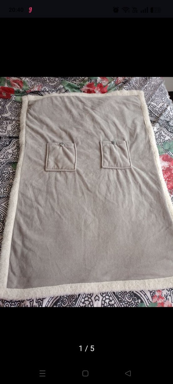 Gri renkte, yumuşak dokulu çocuk battaniyesi, üzerinde iki küçük cep bulunur. Rahatlık ve kullanışlılık sunar. ️