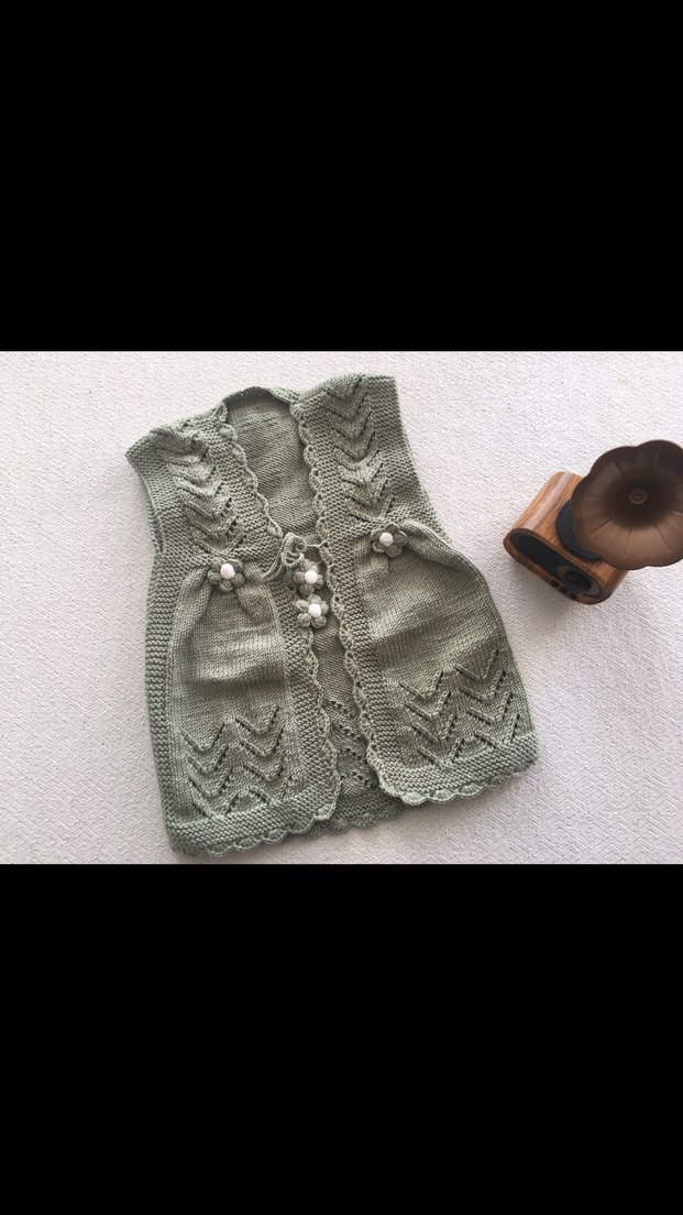 Gri, straplez, örgü çocuk yeleği. Nakış detaylı, ponpon süslemeli, bol kesim ve kolsuz. Ben Bohem tarzına uygun.