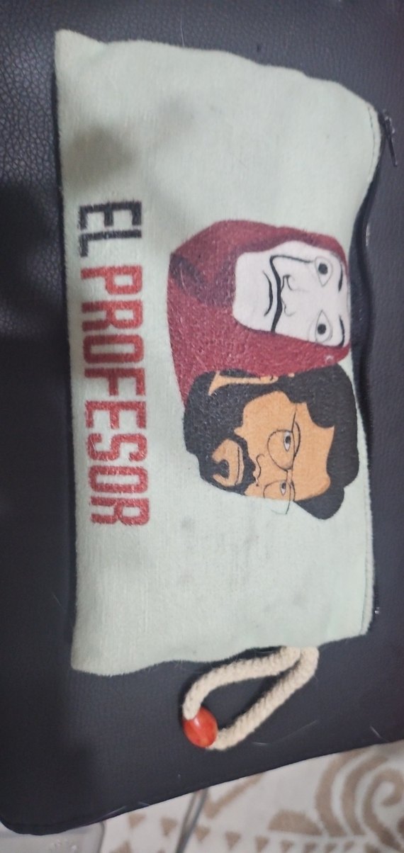 Gri renkte, 'ELPROFESOR' yazılı ve karakter baskılı kalemlik, İpli kapanışı vardır ve okul eşyaları için uygundur.