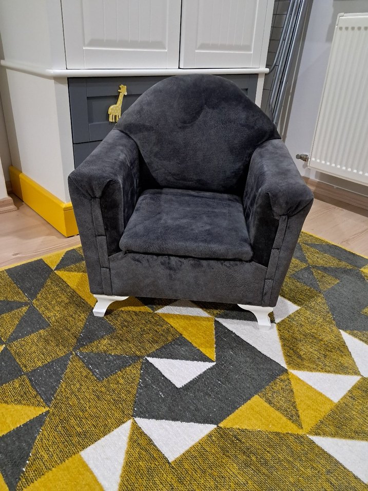 Yumuşak kumaş ve minderli oturma alanına sahip gri çocuk koltuğu, konfor ve destek sağlar. Kompakt boyutuyla çocuk odalarına uygundur.