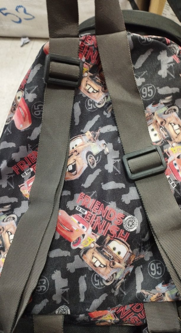 Gri renkli, arabalı desenli çocuk okul çantası, ayarlanabilir askılar ve çoklu bölmeler içerir.