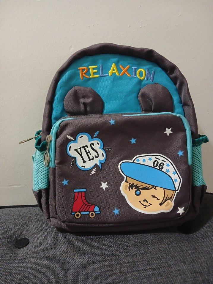 Gri renkli çocuk okul çantasında eğlenceli desenler ve "RELAXION" yazısı bulunur. Önde ve yanlarda cepler vardır, yumuşak dokuludur.