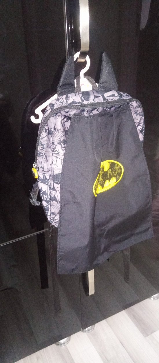 Gri çocuk okul sırt çantası, geniş ana bölme ve ön kapakta Batman logosu bulunan dayanıklı kumaştan yapılmıştır.