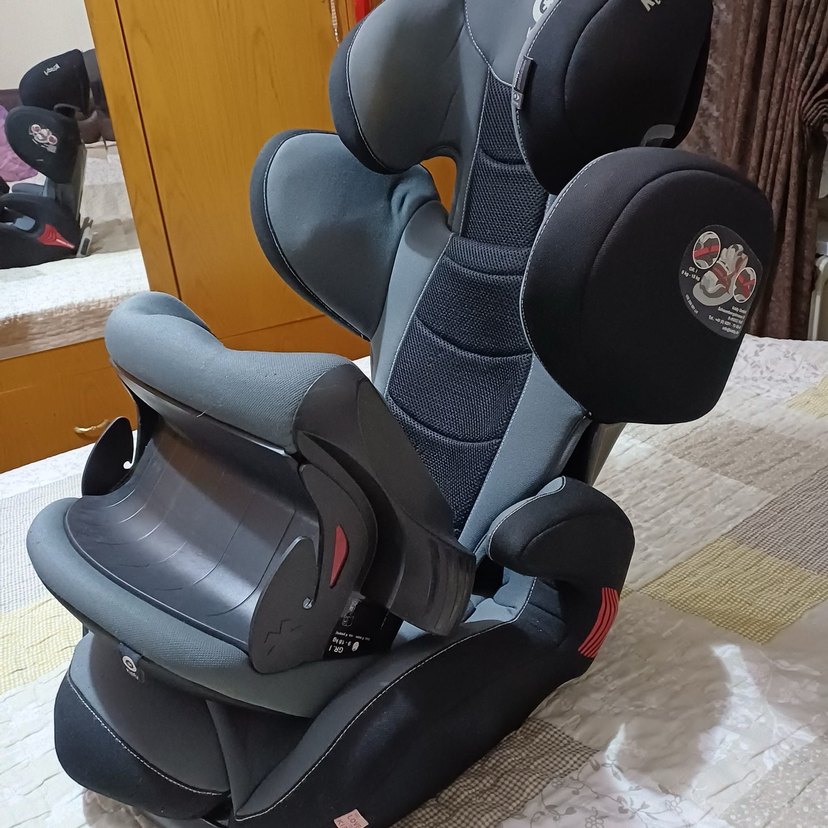 Gri renkli çocuk oto koltuğu, yan koruma ve ayarlanabilir başlık ile konfor ve güvenlik sağlar.