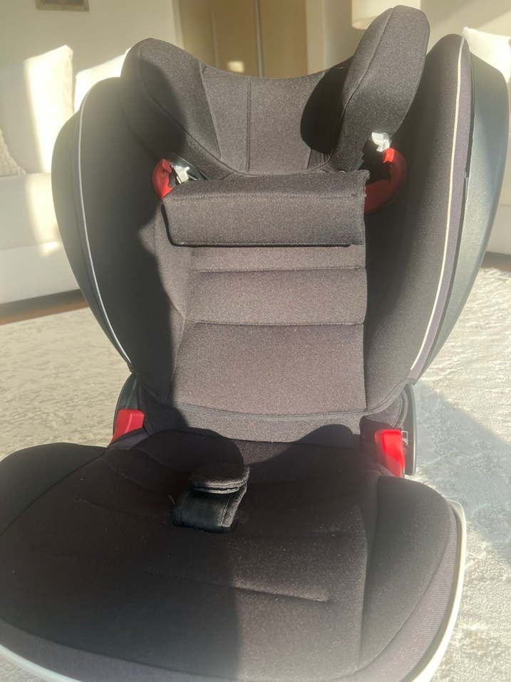 Gri renkli çocuk oto koltuğu, yumuşak dolgulu yan destekler ve güvenli seyahat için emniyet kemeri yuvalarına sahiptir.