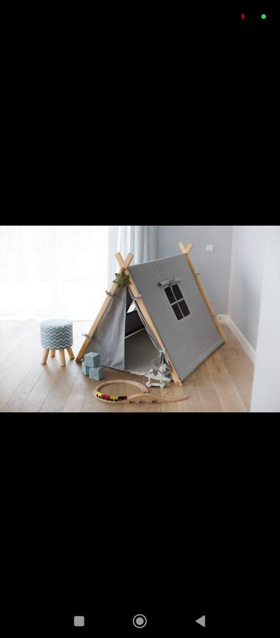 Ahşap iskeletli gri çocuk oyun çadırı, kumaş duvarlıdır. Küçük tabure ve ahşap tren seti ile tamamlanmıştır. ️