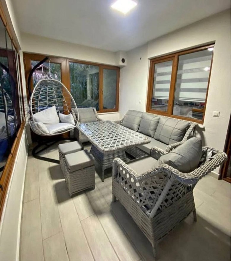 Gri renkli çocuk oyun mobilyası seti, minderli kanepe, koltuk, tabureler ve örgü desenli masa içerir. Rahat ve dayanıklı, iç mekan kullanımına uygun.