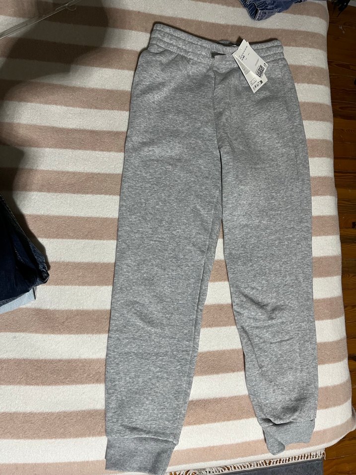 Gri pamuklu, rahat kesim ve normal boyda çocuk eşofman altı.