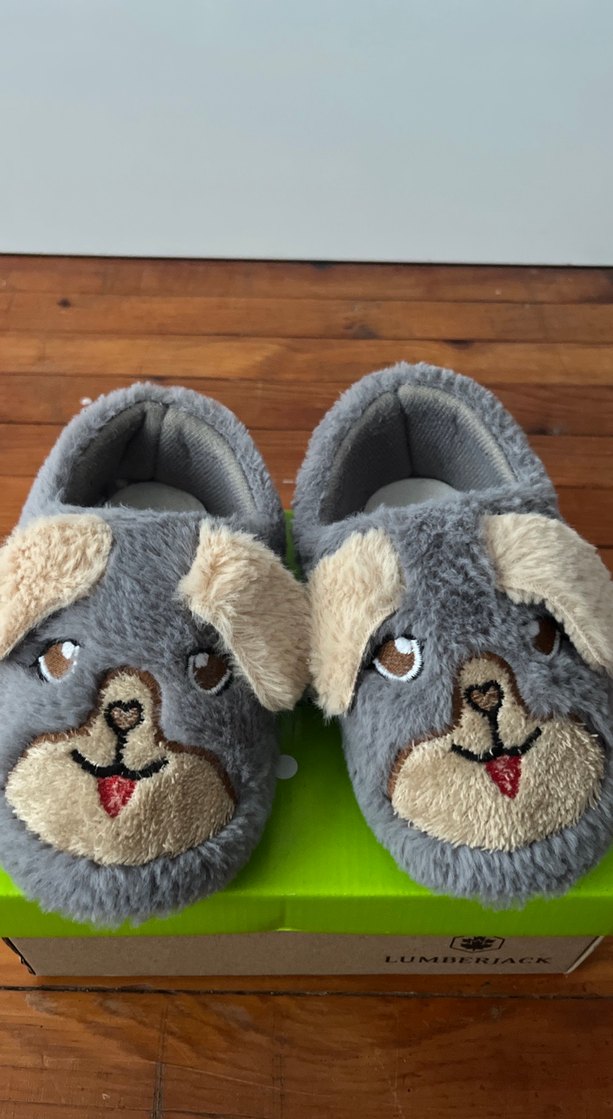 Gri renkli, nakışlı köpek yüzü detaylı, yumuşak ve sıcak peluş kumaştan üretilmiş erkek çocuk terliği.
