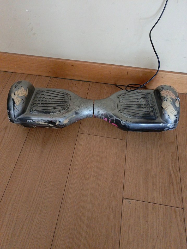 Gri renkli çocuk scooter'ı, kaymayı önleyen dokulu ayak pedlerine sahiptir. Kullanım izleri vardır ancak işlevseldir. ⚙️