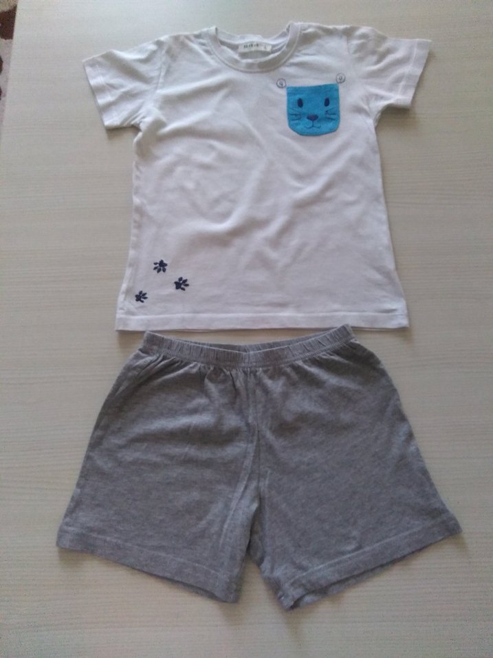 Kısa kollu beyaz tişörtü mavi cep ve patili desenlerle, gri şortla tamamlanmış çocuk takımı.