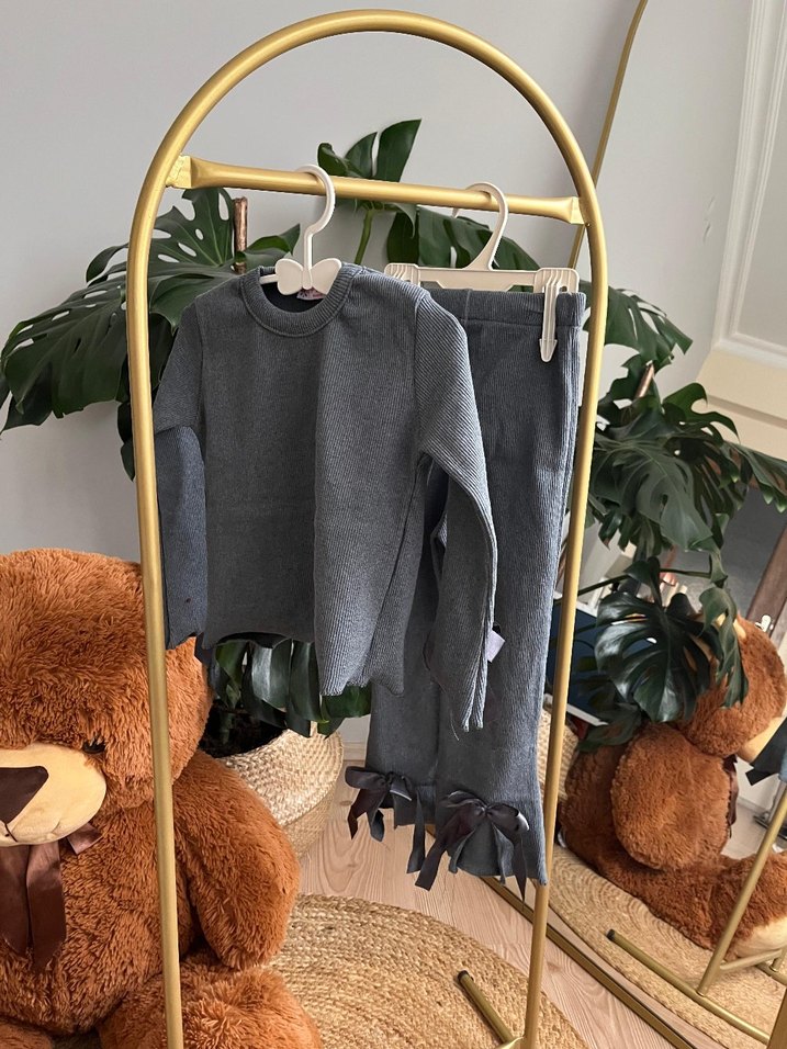 Bu çocuk takımı, uzun kollu üst ve fiyonk detaylı paçalarla gri yumuşak kumaştan oluşur.