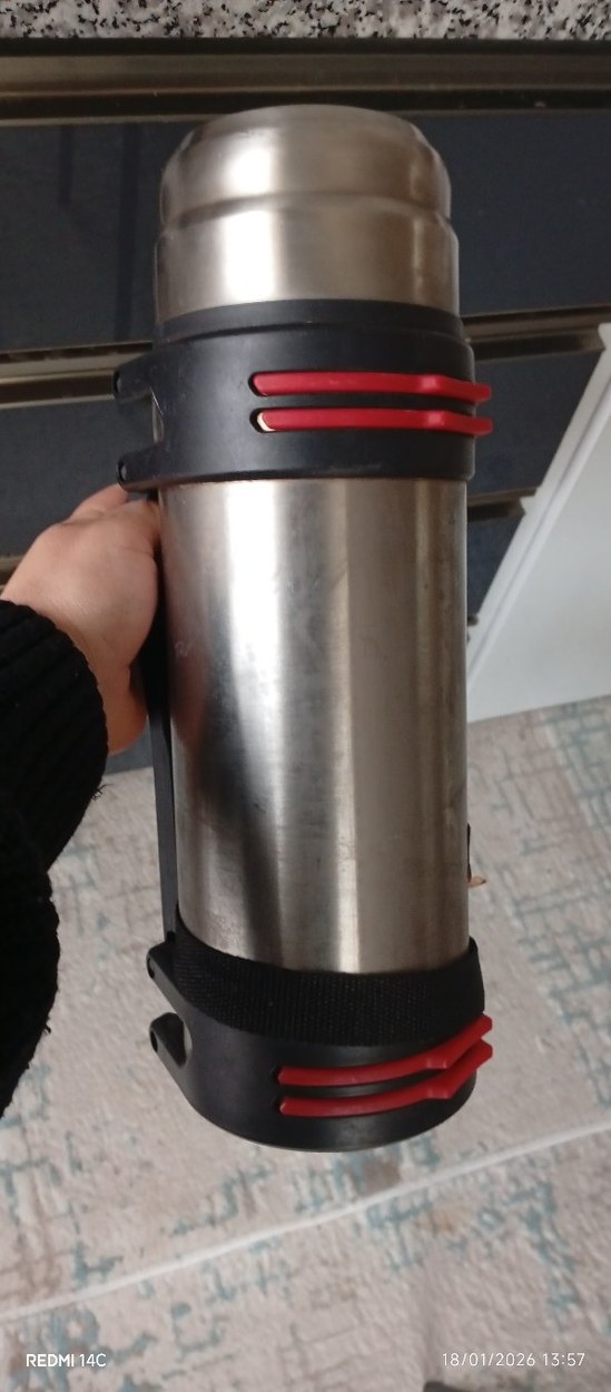 Gri renkte çocuk termosu, kırmızı detaylar ve taşıma için siyah kayış ile sağlam tasarıma sahiptir. İçecekleri sıcak veya soğuk tutar.