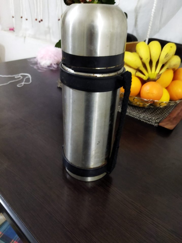 Gri paslanmaz çelikten yapılmış termos, içecekleri sıcak tutar ve taşıma kayışı ile kolay taşınır. Çocuklar için uygundur. sıcak ve soğuk tutuyor iade yok