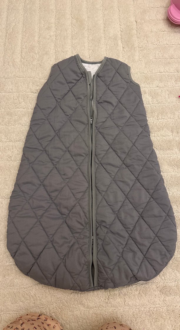 Gri renkli çocuk uyku tulumu, yumuşak sentetik kumaştan üretilmiş, ön fermuarlı ve kapitone desene sahip.