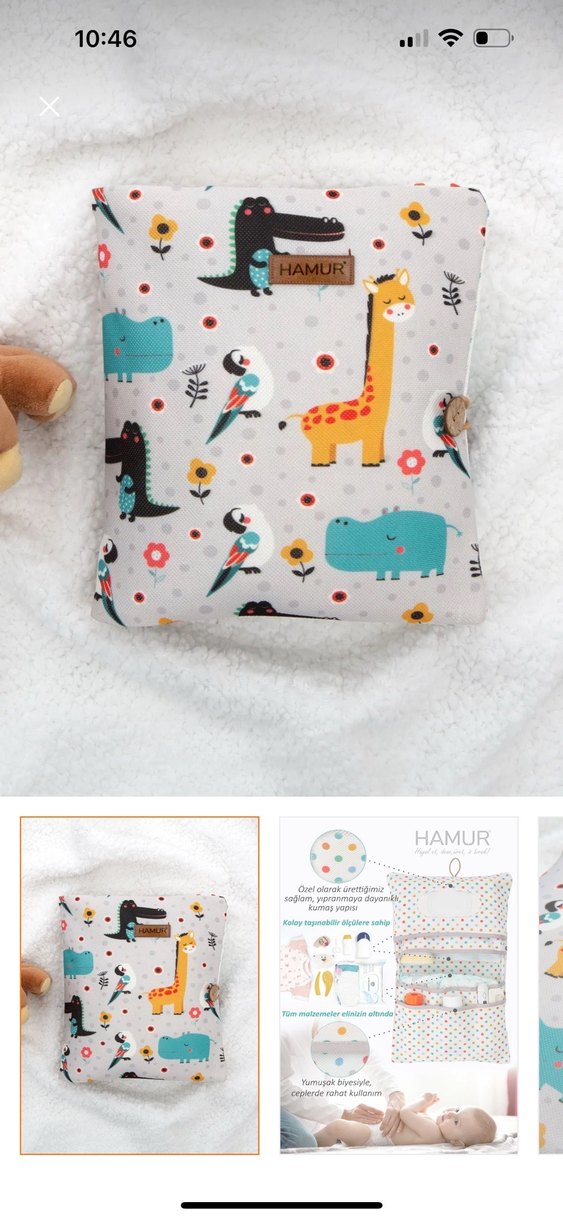 Gri renkte, hayvan desenli alt açma çantası . Yumuşak kumaştan üretilmiş olup "HAMUR" ve "IAMU" yazılı etikete sahiptir.