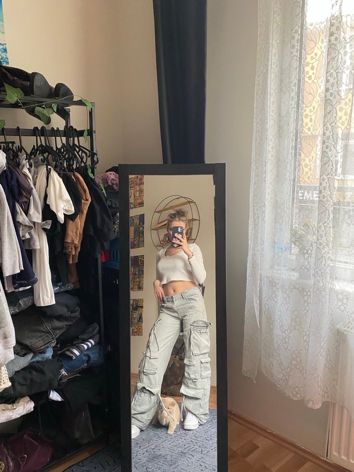 Gri, salaş kesim midi uzunlukta denim pantolon. Günlük kullanıma uygun, rahat ve şık sokak stili görünümü sağlar.