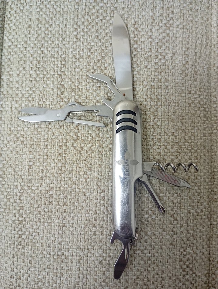 Gri çok fonksiyonlu çakı, bıçak, makas, tirbuşon ve diğer aletleri içerir. Kompakt tasarımıyla çeşitli işler için uygundur. açık haliyle 15cm